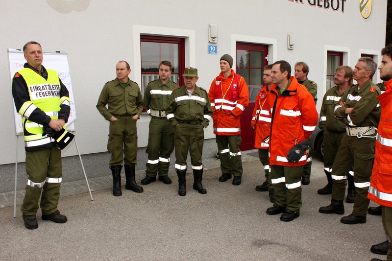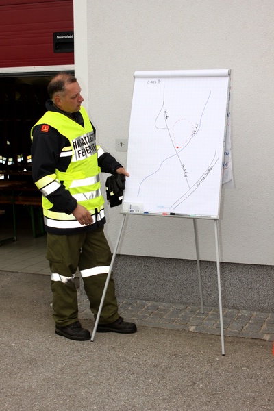 Die 2 mitalarmierten Feuerwehren trafen beim Feuerwehrhaus Pürstling ein, wo kurz der theoretische Teil der Übung besprochen wurde. Es wurde insbesondere darauf hingewiesen, dass die Übung vorwiegend der Praxis, also der Wasserförderung in unwegsamen Gelände, und der Brandsaumbekämpfung bzw. der Verteidigung dienen soll.