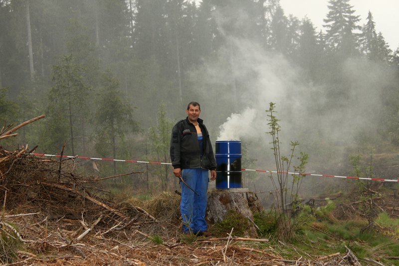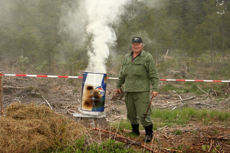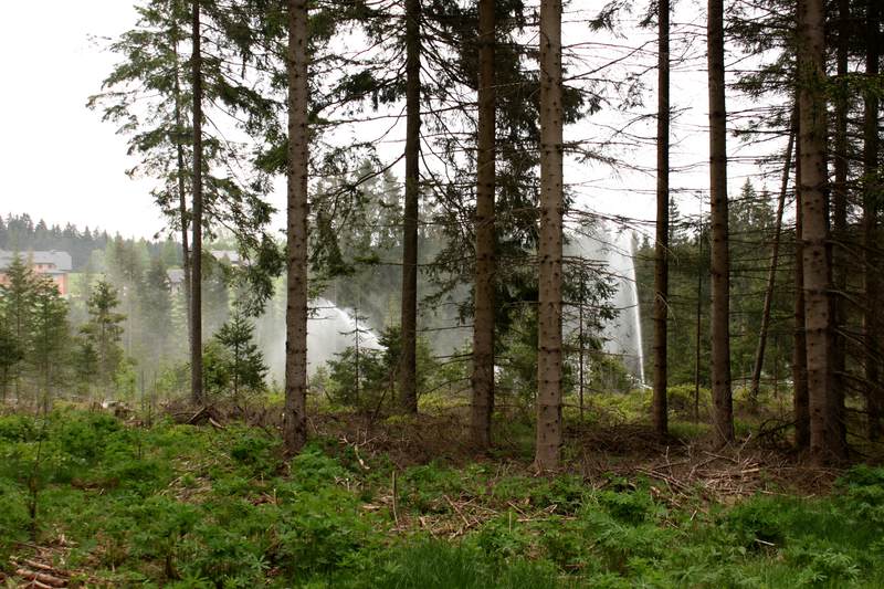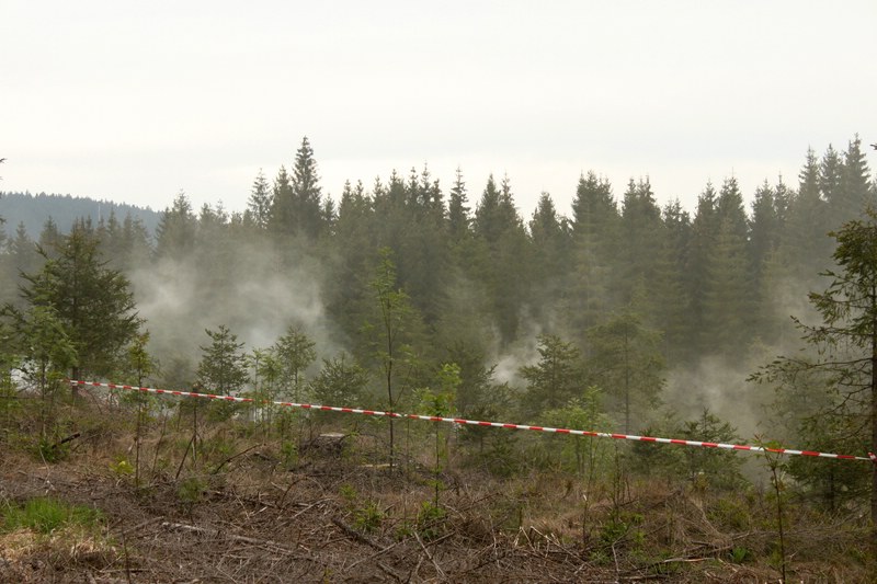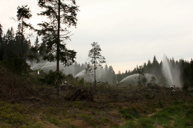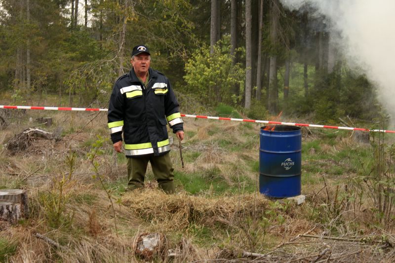 Der Waldbrand wurde mittels brennender Fässer simuliert, das Absperrband stellte den Verlauf des Feuersaumes dar.