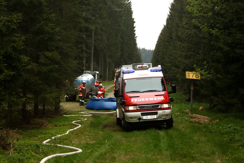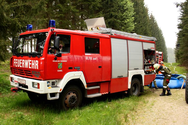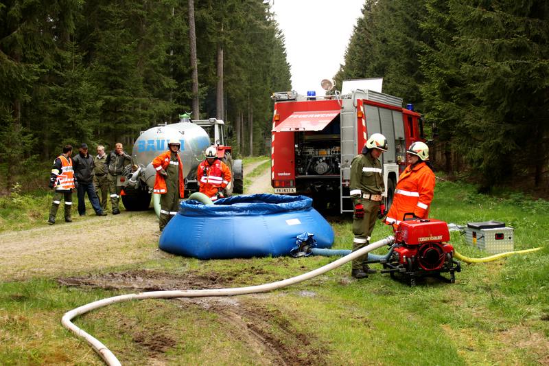 Am Übungsort eingetroffen, gab der EL an die Gruppenkommandanten der FF Pürstling und FF Gugu-Schönberg den Befehl den Feuersaum von hinten über die Flanken zu bekämpfen. Die FF Sandl erhielt den Auftrag den Waldbrand von der Seite an einer Rückholgasse zu bekämpfen. Hier wurde besonderes Augenmerk auf die Beweglichkeit der Einheit gelegt und somit wurde mit Falttank und Vakuumfässer die Wasserversorgung hergestellt.
