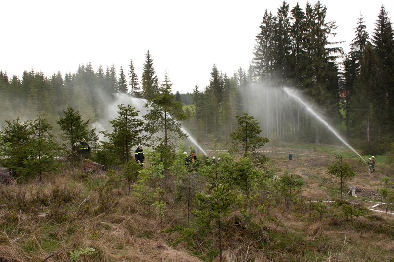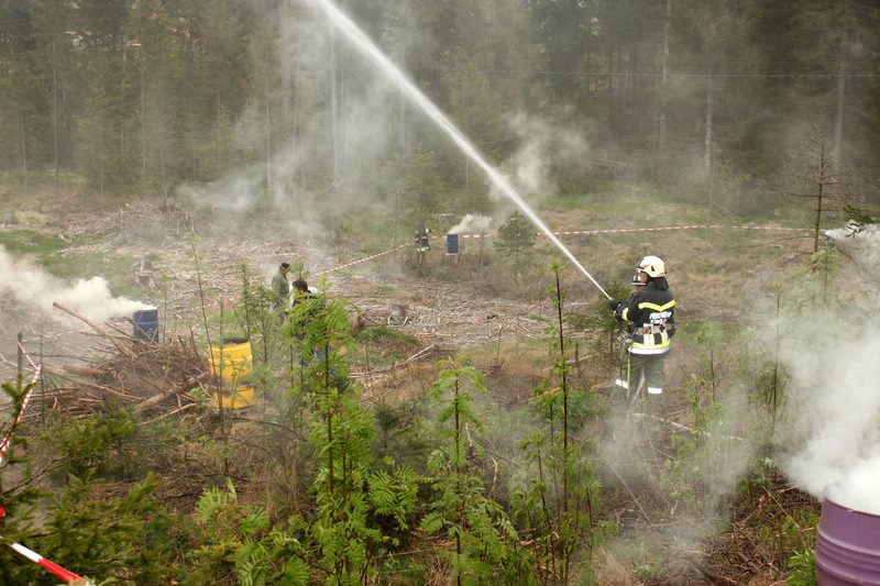 Übungsannahme war, dass ein Landwirt beim Verbrennen von Reisig die Kontrolle über das Feuer verloren hatte und sich der Brand in einem abgeholzten Bereich des Waldes rasch ausbreitet.