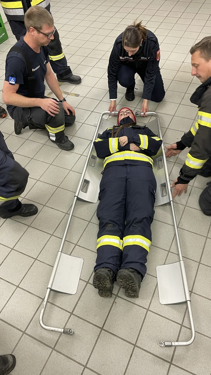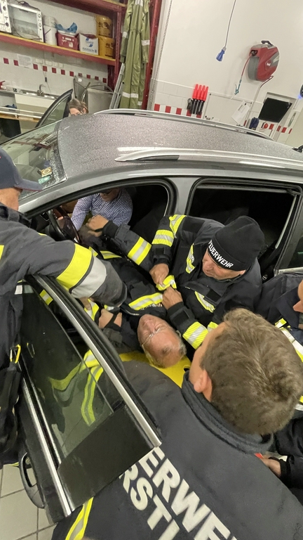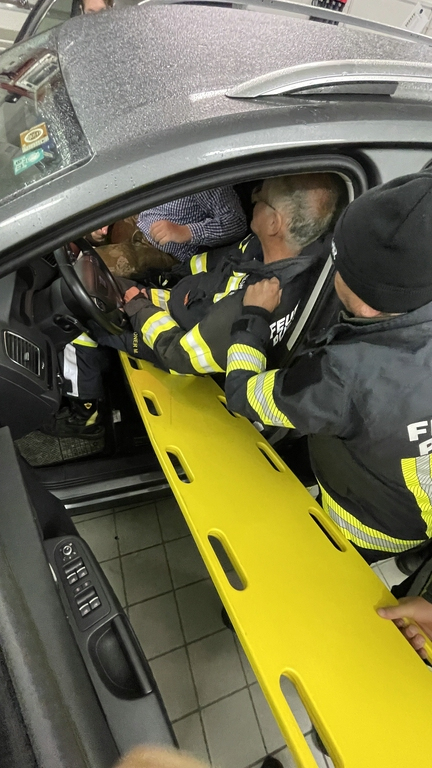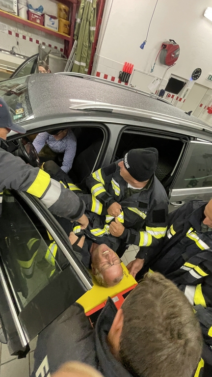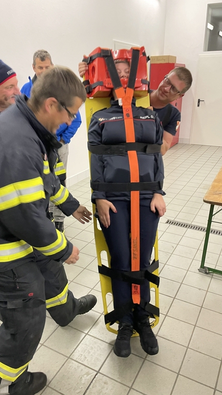 Während der Vermittlung der Grundkenntnisse tauchten schon viele Fragen auf und so wurden auch noch die Schaufeltrage (im Vergleich zum Spineboard) und die Rettungsplattform näher unter die Lupe genommen und getestet. Auch eine Personenrettung aus einem PKW wurde mittels Spineboard auf mehrere Varianten getestet.